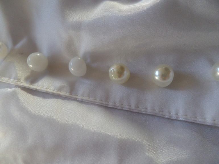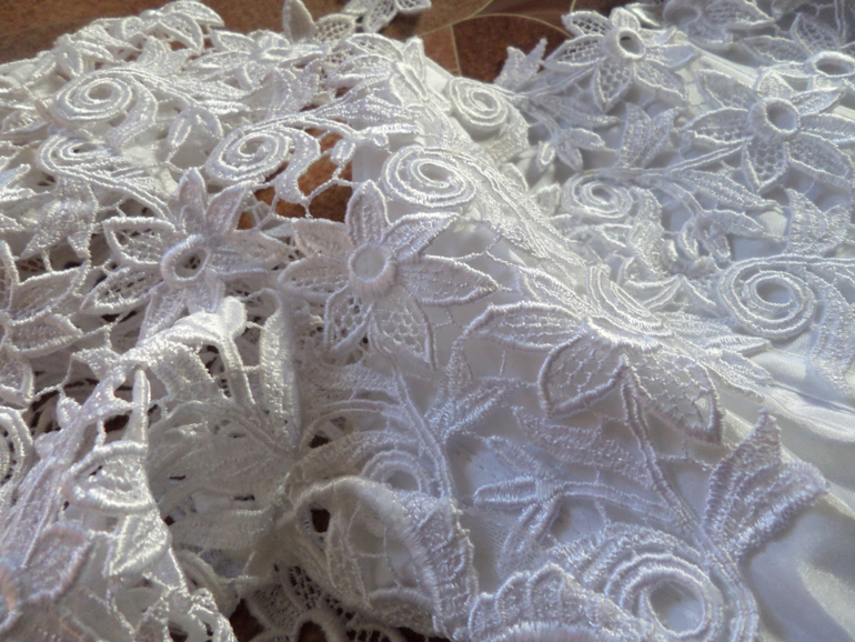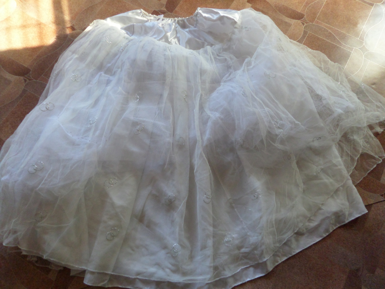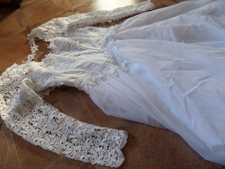 В-третьих, свадебное платье. Чисто как платье его использовать уже нельзя, долго лежало, местами немного пожелтело, облезли пуговицы (на фото видно). Но кружева остались белыми, может их можно куда-то применить. А также нижняя юбка - на мягком каркасе. Размер платья 42-44.