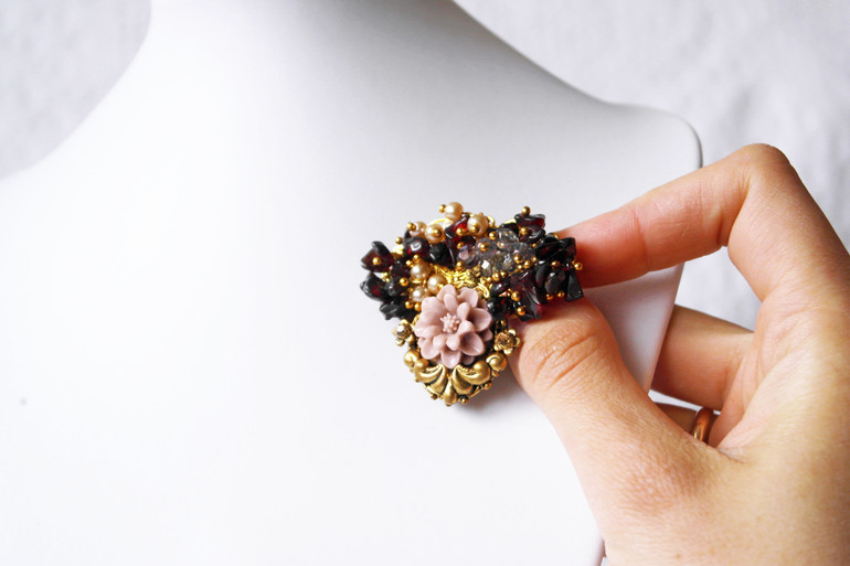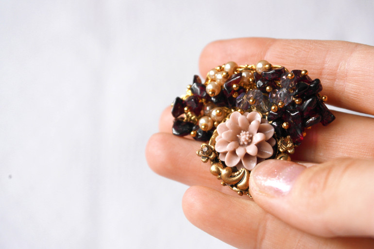 Не совсем "ягодная"... Но определенно "растительного" происхождения) Дань осени и красоте увядающей природы - россыпь гранатовой крошки и чешских бусин. Сеттинг под цветочек - настоящий винтаж, ему не меньше сорока лет.