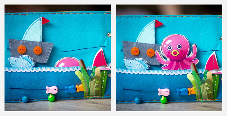 В осьминожке пищалка, осьминожка и рыба прячутся в кармашек. Рыбки и кораблик плавают по шнуру. Рыбка прячется в водоросли. Развитие мелкой моторики.