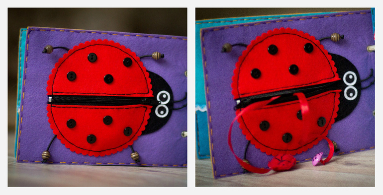 Божья коровка на молнии, внутри детки: одна-пуговка, вторая-с бубенчиком. Лапки-перетяжки. Развитие умения расстегивать/застегивать молнию.