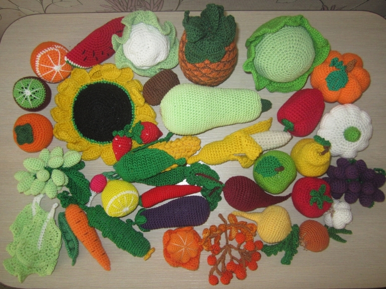 Отличный урожай!!! Ярко, аккуратно, продумано до мелочей!!! Представляю как интересно ними играть)) СУПЕР!!!п.с. можно вопросик — какими нитками вы вязали?