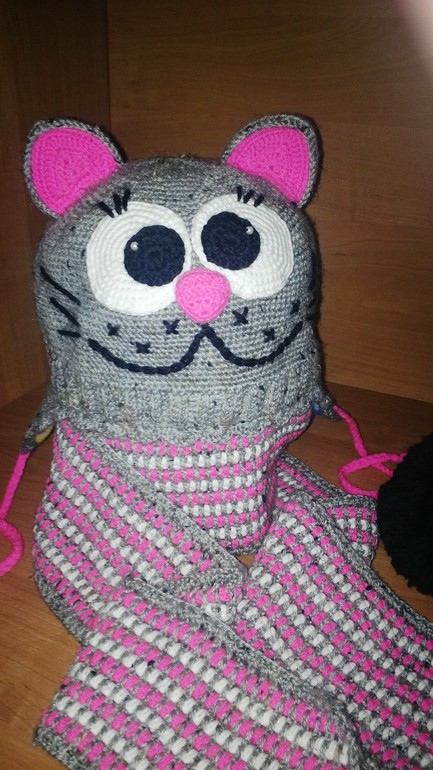 Комплект для старшей дочери связан из Камтекс Соната, шапочка в 2 нити, бактус в одну. Ушло 3 мотка. Подклад флисовый. Уже вовсю носим.
