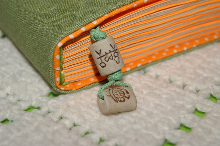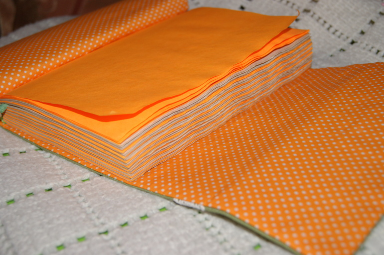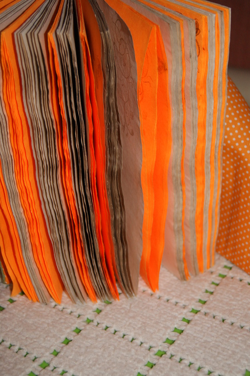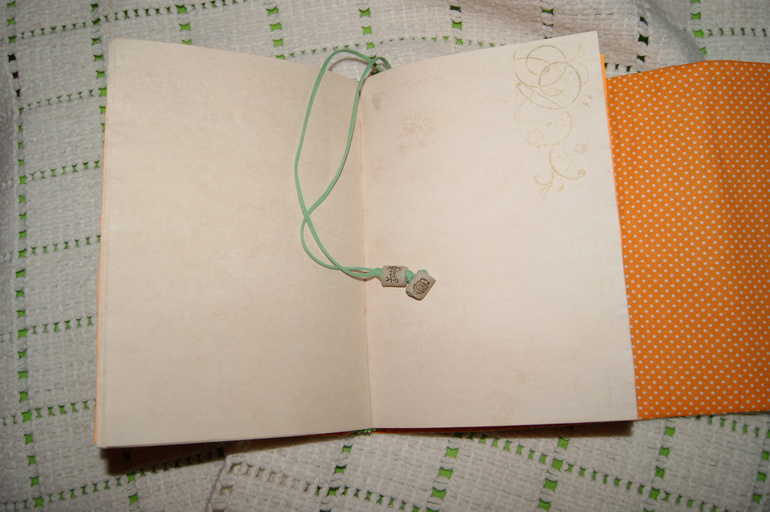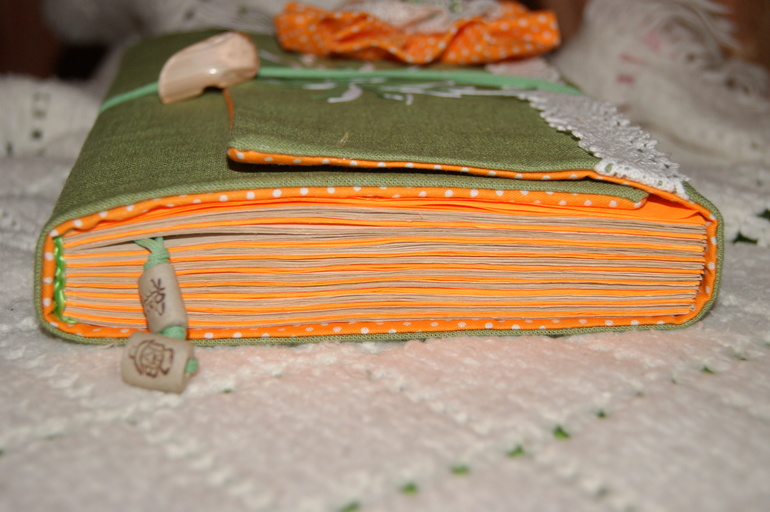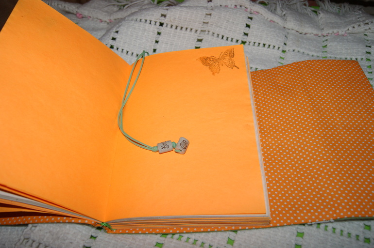Блок двухцветный.Листы состарены и тонированы кофе.Апельсиновые листочки тоже прошли процедуру состаривания.Часть листов отштампована.