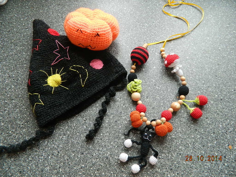 Пригласили нас на вечеринку, посвященную Хэллоуину. Пока точно не уверены, что поедем (как погода наша непредсказуемая будет!), но подготовку уже начали))) Шапка-шляпа ведьмы для девочки 6-8 месяцев, тематические слингобусы (мухомор, лишайник и ягодки для зелья, жуткие кроваво-черные бусины, традиционные для праздника тыквы), слингоподвеска Черный кот + вкуснющие можжевеловые бусины. И тыква-шелестящий мячик. Мы к Хэллоуину готовы, а Вы?)))