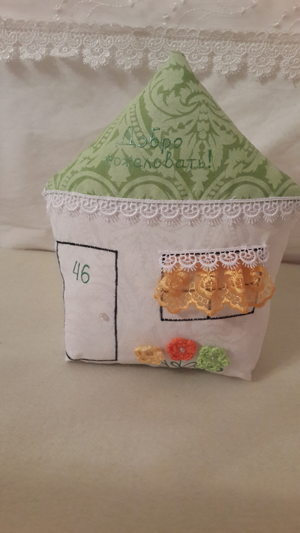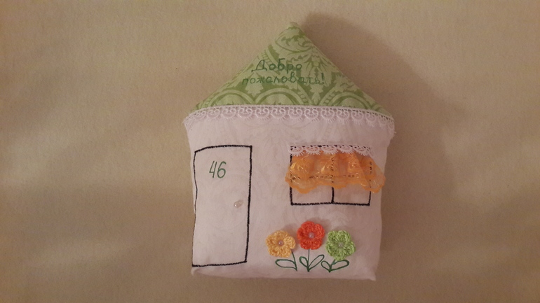 Домик сшит из хлопка, украшен кружевом, бусинами, цветочками, связанными крючком, и краской для ткани.