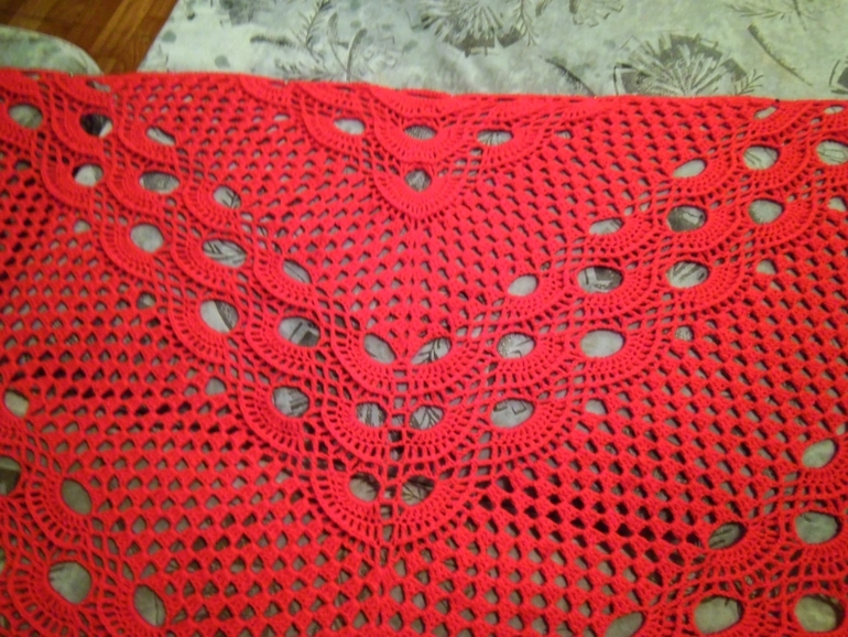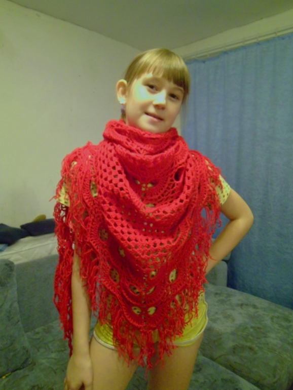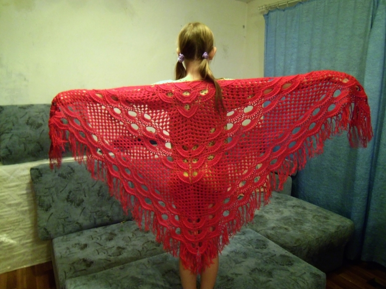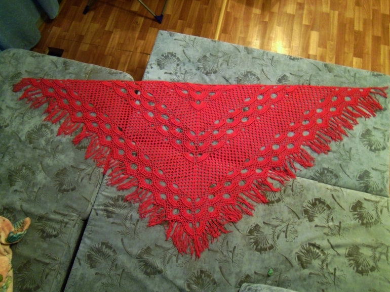 Связалась на заказ вот такая красивая шаль. Нитки Baby Vita ,ушло с мотка по 400 м.По просьбе заказчицы цвет ярко-красный. Размер в ширину без бахромы 190 см, в длину 90 см. Первый раз вязала шаль, но это не сложно. Особенно в начале вяжется так быстро))) А в конце ждешь, когда же закончится ряд)))