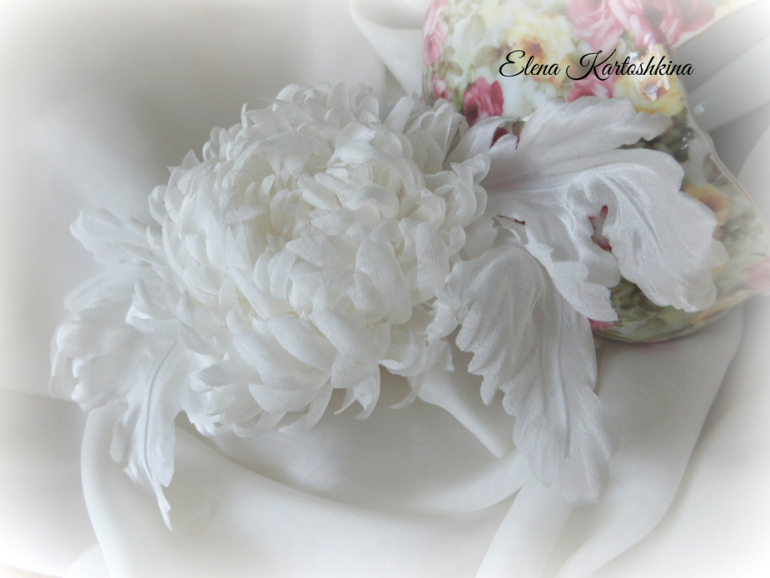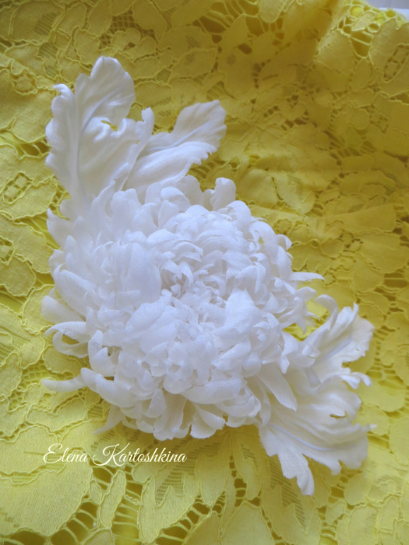 Чудесная кудрявая хризантема из трех видов шелка,разных по плотности. Крепление заколка зажим.