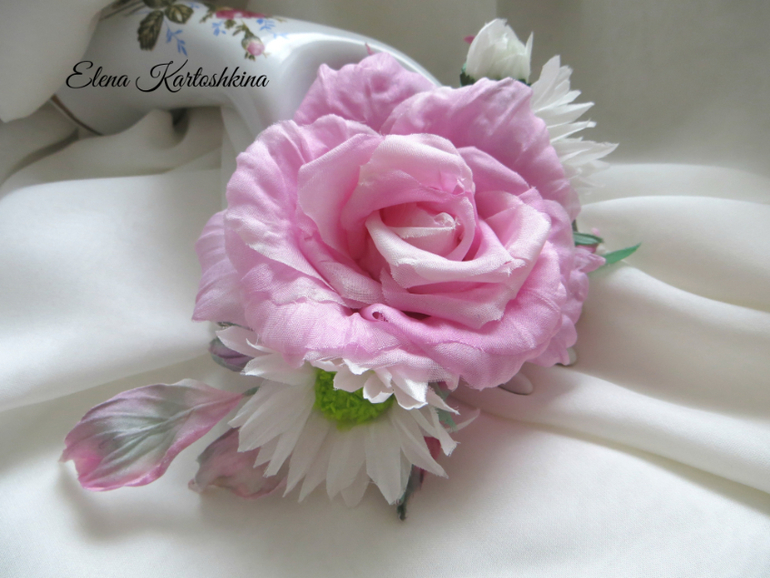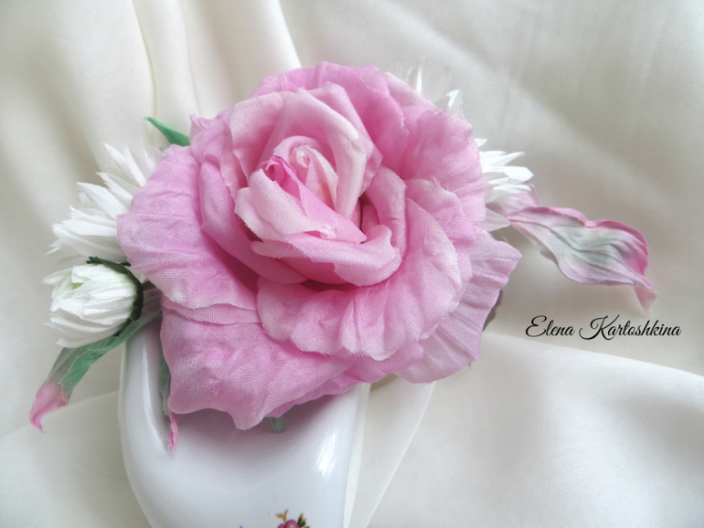 Нежная роза с тремя ромашками разной степени раскрытости. Украшение из 4 видов шелка разных по плотности. Крепление заколка зажим.