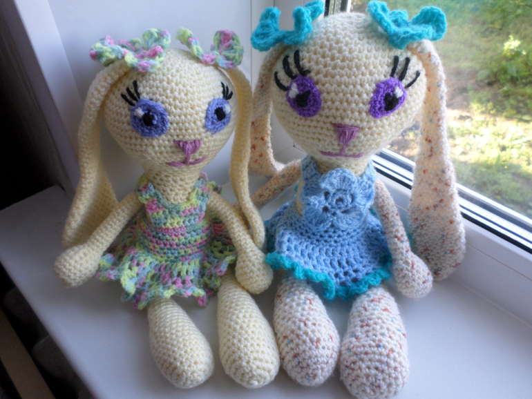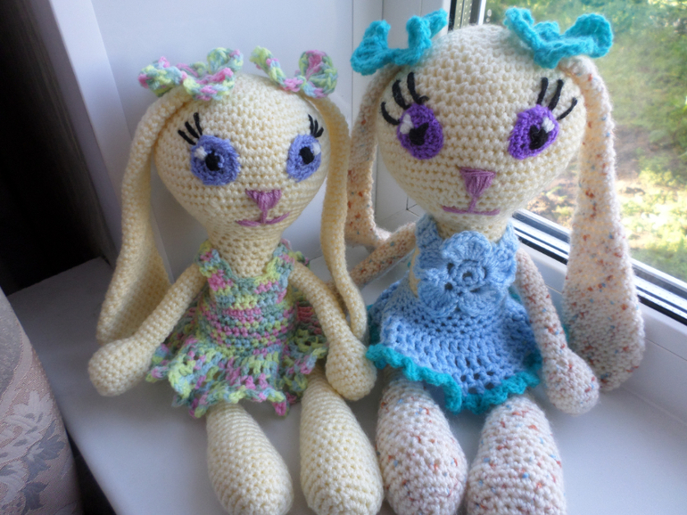 Связала первого зайчика, а потом узнала что к нам приезжают гости, и в подарок быстренько связала второго. Вот такие сестренки у меня получились)))