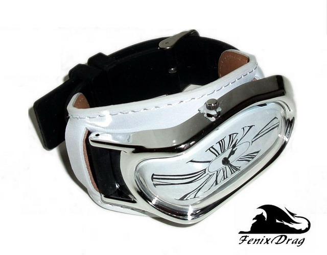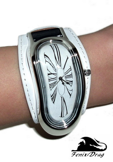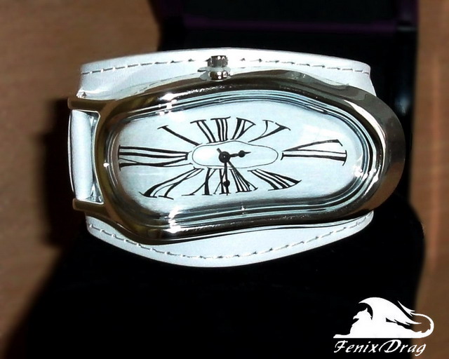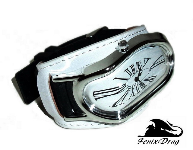 Браслет посвящен знаменитой картине моего любимого Сальвадора Дали «Постоянство памяти», с мягкими стекающими часами. Сам модный аксессуар представляет собой широкий ремешок (браслет) из белой кожи (возможны другие цветовые решения) с необычными изогнутыми наручными часами с римскими цифрами. Кажется, что часы как будто стекают по руке.