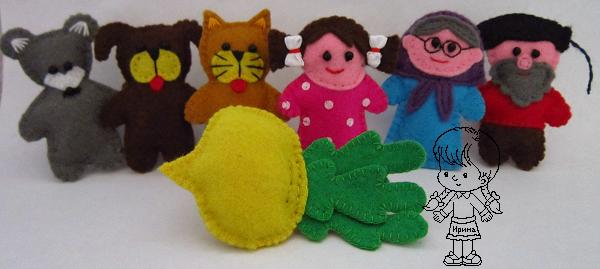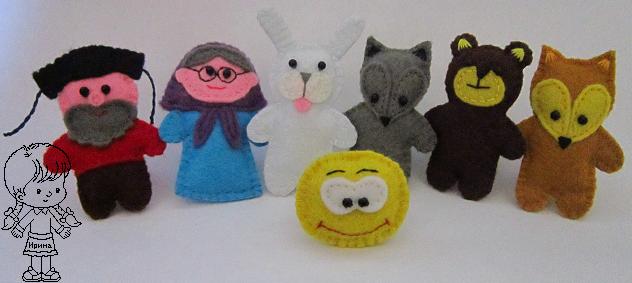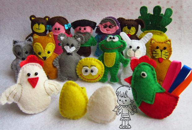 Всего получилось 17 героев (внучка, дед, бабка, мишка, лиса, волчок, зайка, лягушка, мышка, кошка, Жучка, репка, колобок, курочка Ряба, петушок, яичко простое, яичко золотое), но их хватает на множество сказок.