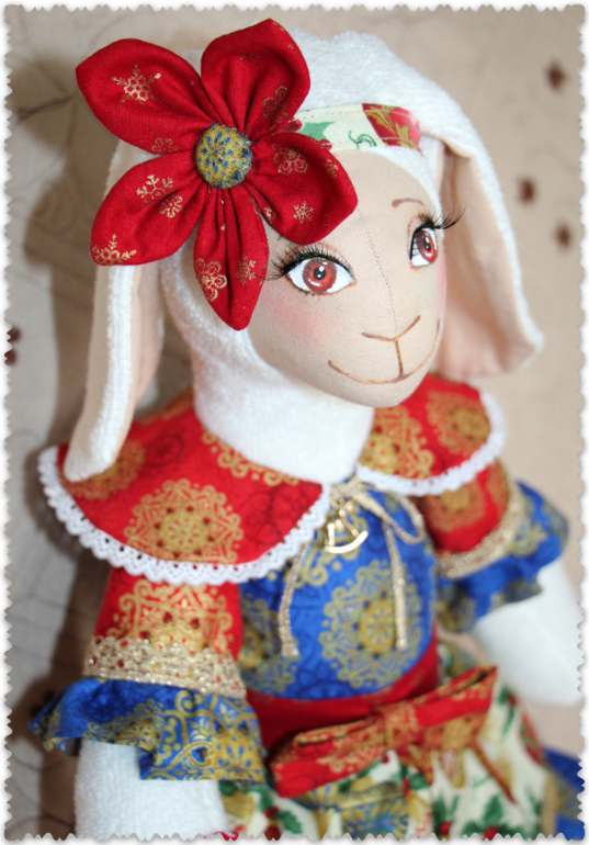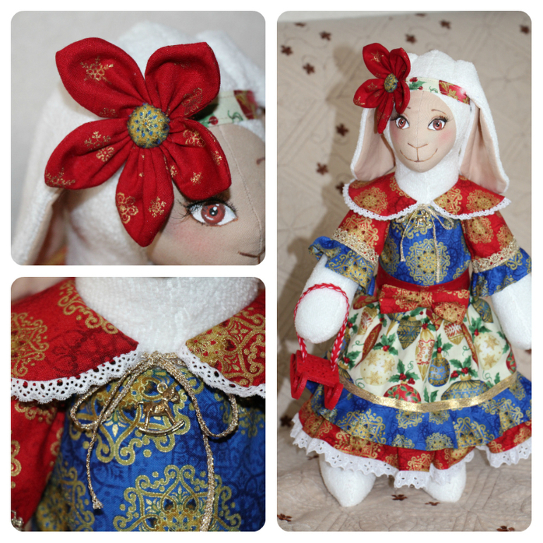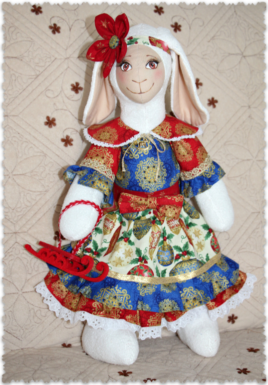 Овечка Моника, рост 50 см. Одета в свое самое праздничное платье, в лапке елочная игрушка- санки(из ИКЕА). А вообще Моника очень улыбчивая, нежная и доброжелательная овечка, которая обязательно принесет мир и радость в дом!
