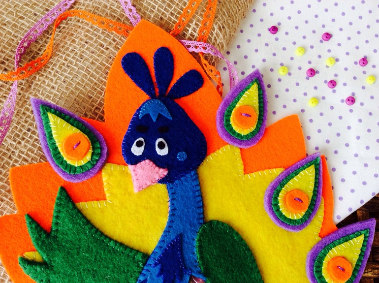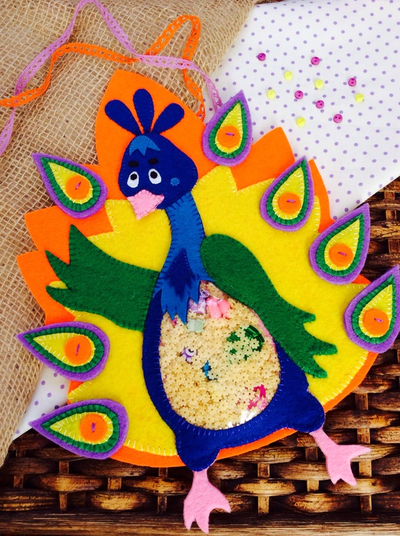 Игрушка изготовлена из фетра разной толщины, используется для развития мелкой моторики ( поиск предметов, вращение перышек). Павлуша ищет милого и доброго дружочка. Будет приносить ему радость и счастье:)