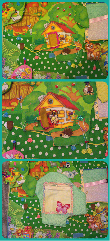 В пруду плавают рыбки, у каждой свое наполнение:большие,средние и маленькие бусинки, одна рыбка мягкая. Лягушка прыгает в пруд и обратно на мосток. Элемент "Веселая ферма" шуршит. На нем 2 ряда бусин,одни передвигаются легко, вторые с усилием. Цветочки на пуговичках. Перед коровами карман-травка, так же на нем рассматриваем пуговички.