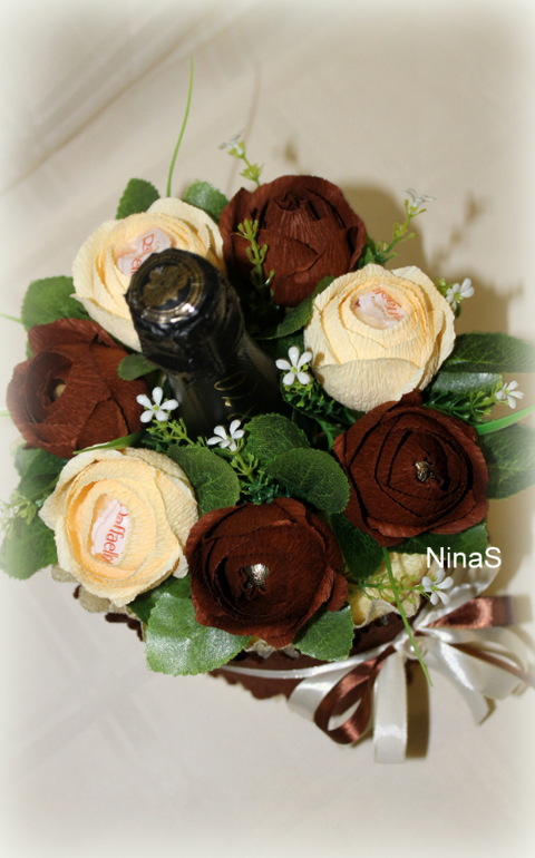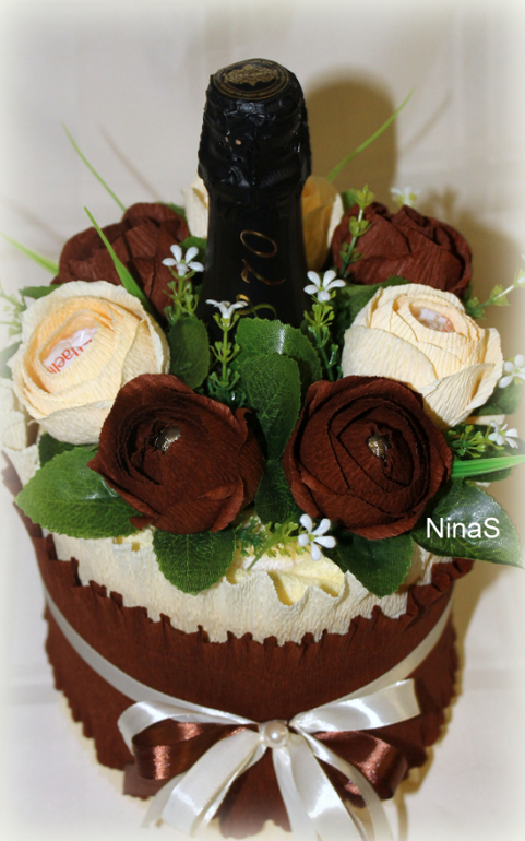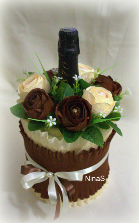 Как всегда оригинально)) Особенно шоколадно-ванильный тортик)) Только мне кажется, бутылку сверху тоже надо бы бутончиком прикрыть, как-то она немного откровенно торчит..... (могу ошибаться, я не профи, хотя, может и не права)