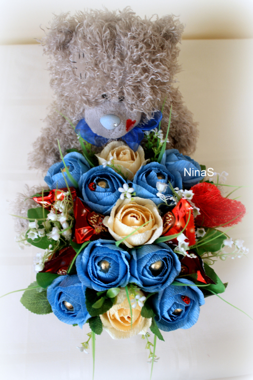 Замечательные работы! Композиции получились оригинальные, отличная придумка с бутылкой и полотенцем ))) и мишка в интересном цветосочетании.Розочки у тебя чудесные! Каждый раз на них любуюсь ))) Композиции получились оригинальные, не избитые.