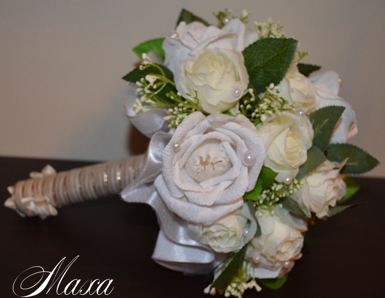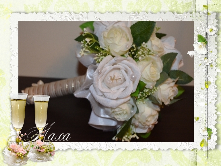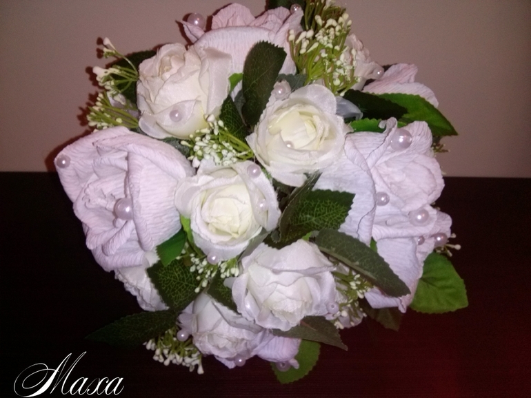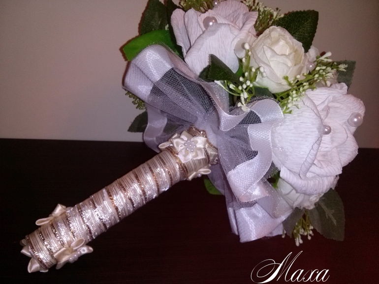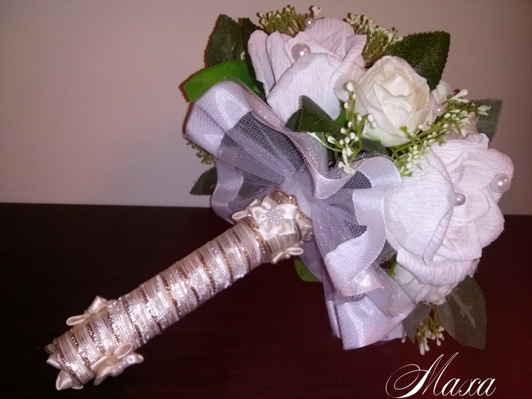 Ой, насколько ж он вымученный получился..., никогда такого не было, вот чтобы совсем не шел, испорчены две портбукетницы (не люблю внутри этот сыпучий материал...), каркас, сколько ленты-просто не сосчитать, про время вообще отдельная песня..., вчера с 23 до шести утра, сегодня в два подхода, в результате выбросила все с чем не шло, лежал один букет из белых роз, его полностью разобрала и делала из тех розочек, за час сделала полностью, уже хотела звонить девочке, для которой делала, говорить, что не смогу сделать, но упрямство рукодельное сделало свое дело, вот и он, косячки есть все равно, не большие, как Вам? Фото с телефона, и только сейчас сделаны, обработала как смогла...