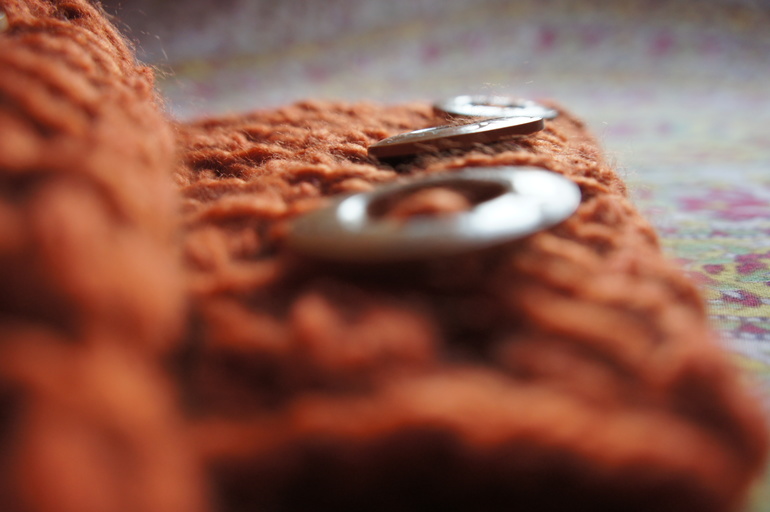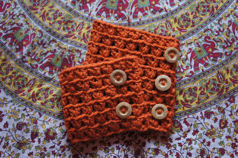 Размер детского снуда 21 на 19 см, взрослого - 25 на 24 см. Декорированы деревянными пуговицами.