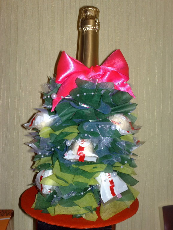 Зеленый фетр грубовато смотрится в виде "хвои",рафаэлки красненькие, а бантик розовый.Посоветовала бы с цветом поработать немного.