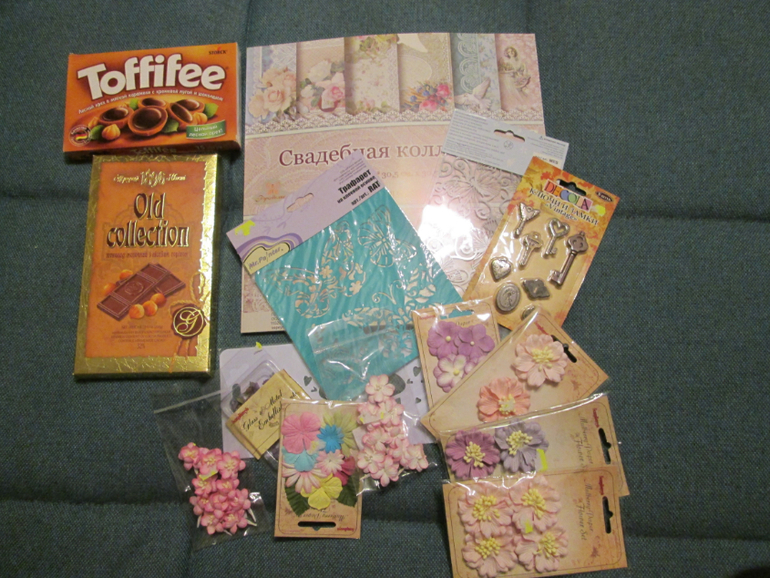 и мне богатства! набор бумаги,куча красивущих цветов,трафареты,украшалки всяческие,как раз начала делать альбом для дочи-всё пойдёт в дело!!!
