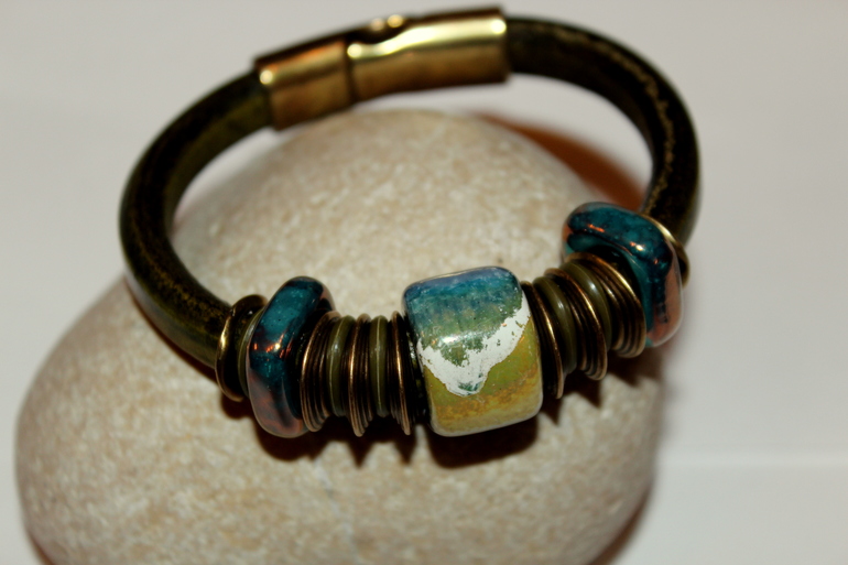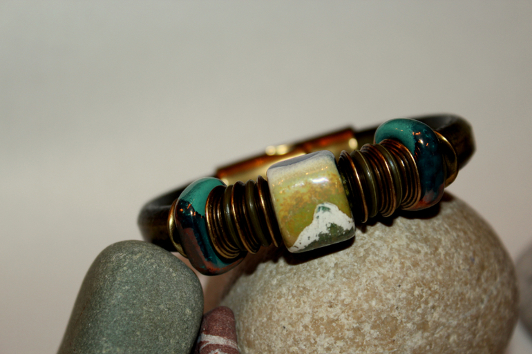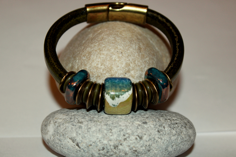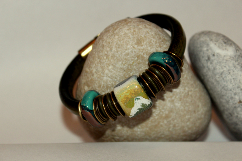 Браслет с оригинальными бусинами. Интересные переходы краски создают неповторимый стиль и цвет. Натуральная кожа, керамика.