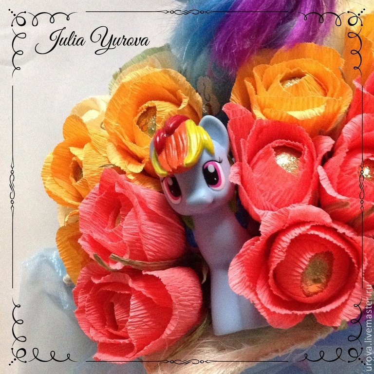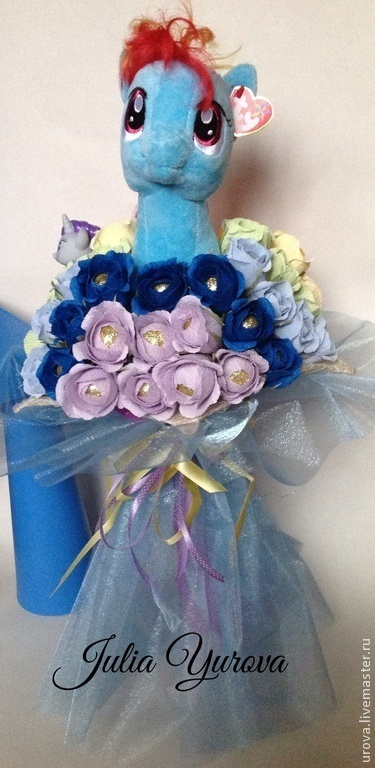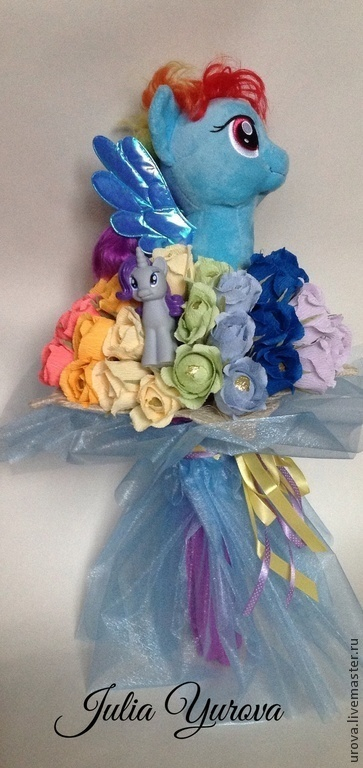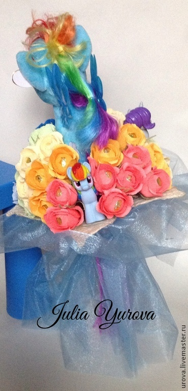 Какие обиды, что ты! Согласна по всем пунктам. Кстати, замятость заметила только на фото, вживую вроде все хорошо было. Но в букете все имправила, а вот перефотографировать уже не успела. На улице днем все равно тьма, ничего не видать, а с фото так вообще беда.Про мелкоцвет — это пожелание было, отсутствие любых искусственных цветов.А вот с посадкой я помучилась. У коня ноги длиннющие, все место заняли (игрушка 33 см), и оказалось проблемой запихнуть цветы. Несколько раз перебирала, и положение радуги меняла. Этот вариант мне показался самым удачным. Соответственно и фигурки уж куда впихнулись)))) Но в целом я довольна результатом, определенно в жизни он интереснее. Я там и органзу собрала юбочкой впервые и переход более другой. Кароче, надо нанимать фотографа))))