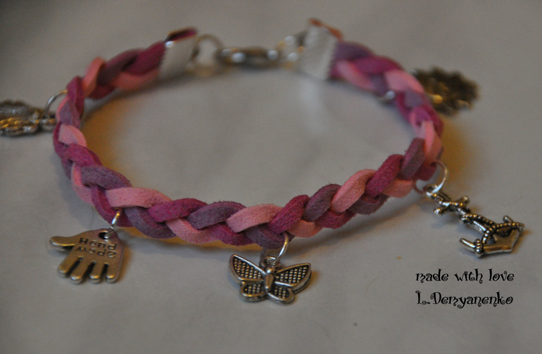 И браслет из замши с подвесками тоже фиолетово-розового цвета