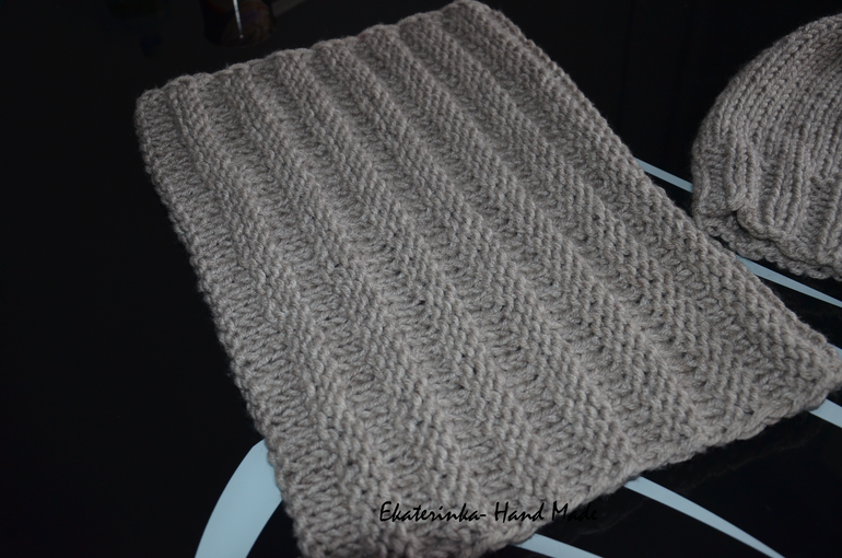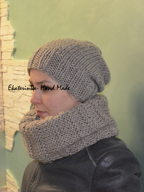 Спасибо! Здесь описание шапки, а снуд вяжется просто. На прямых спицах поочередно три ряда лицевой гладью, три ряда платочной. На необходимой высоте петли закрыть и соединить два края.