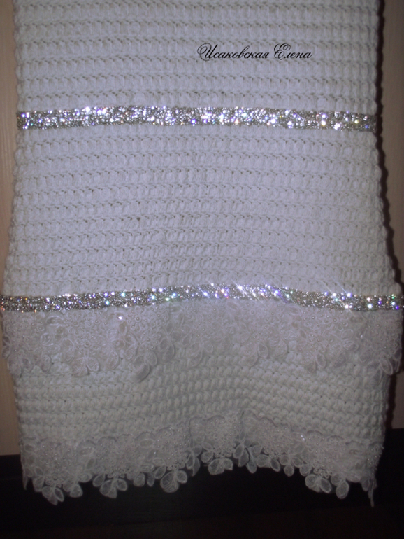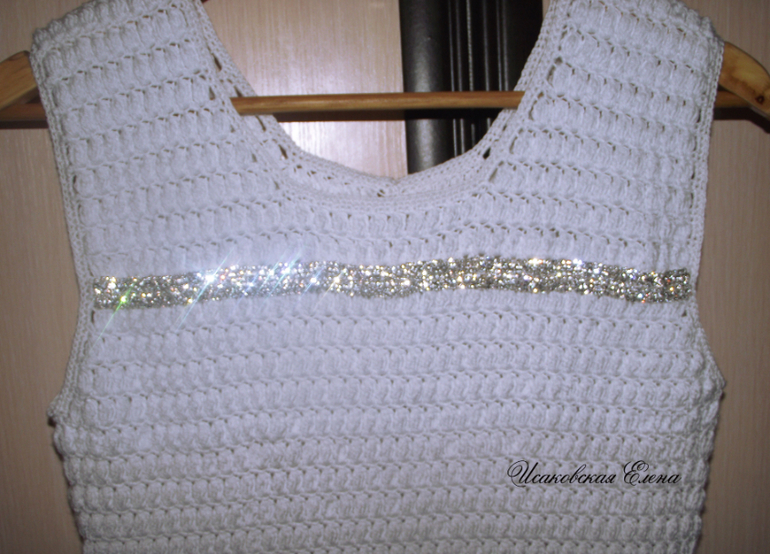 Мое многострадальное платье, наконец-то я его доделала. Связано на заказ, для моей, уже постоянной заказчицы))) Пряжа Ализе Дива 650 гр., стразы 5 метров и кружево 2 метра)))) Итого вес 1,100 кг))) Тяжеленькое получилось. Вот чего получилось, фоткала уже вечером, так что фото не очень))