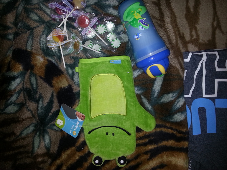 Лягушки как же без них))) он их обещает.Поильник супер.Варежка для купания .в поильнике были конфетки как я поняла.Галь это что конфетки?