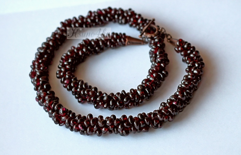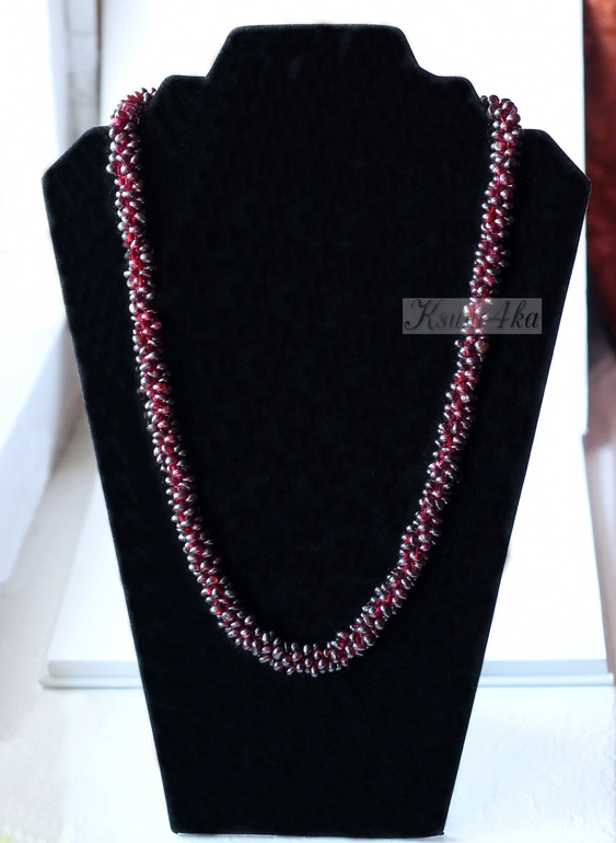 Недавно ко мне обратились с просьбой починить порвавшийся жгут из гранатовых бусин. Судя по всему, выполнен он был в технике плетения с помощью двух игл. Но поскольку я не сильна в бисероплетении, да ещё и люблю вязать жгутики крючком, то с выбором техники исполнения у меня долгих размышлений не было.