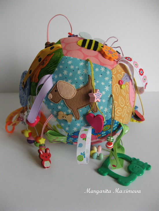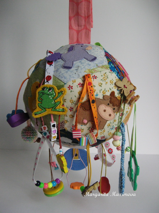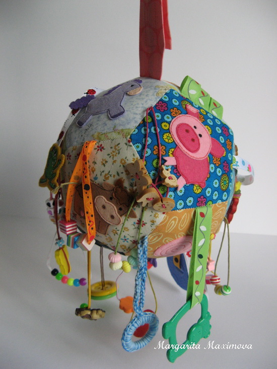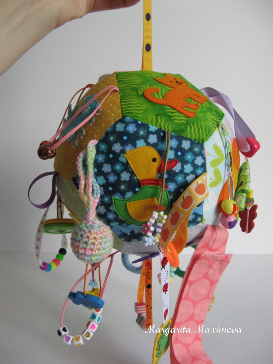 Мяч имеет 30 разнообразных подвесок. Одна подвеска с липучкой, с помощью которой можно закрепить мячик на кроватке, манеже.