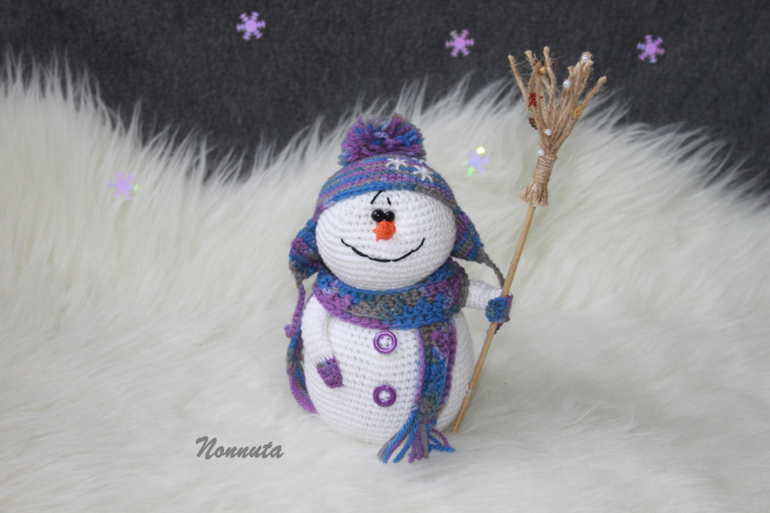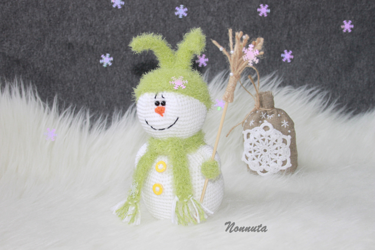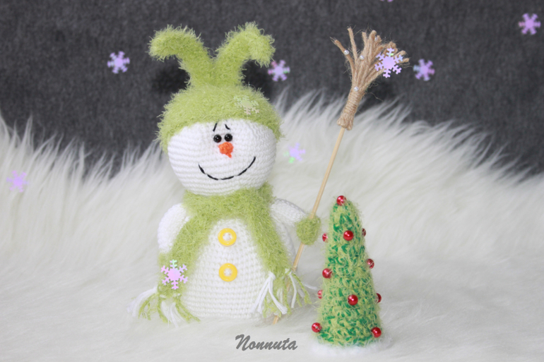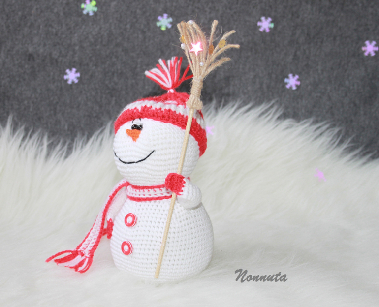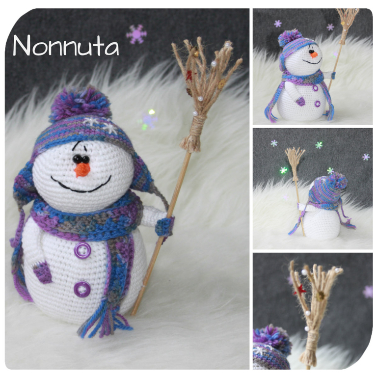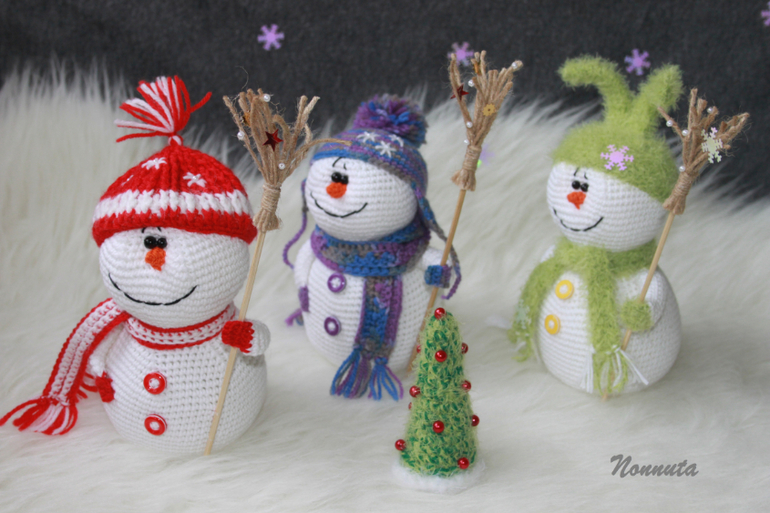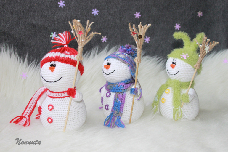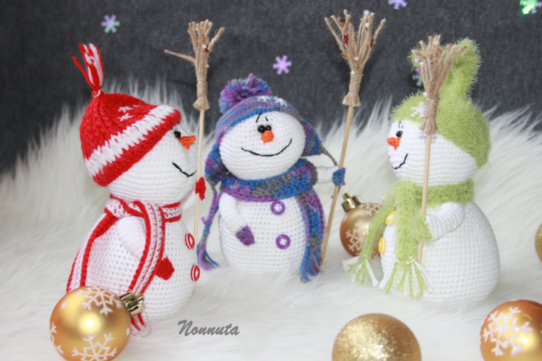 С самого лета я загорелась связать этих снеговичков и вот наконец-то руки до них дошли. И сразу как-то настроение новогоднее проснулось) Снеговички получились у меня дворниками, но мусор они метут не обычный дворовый, а новогодний. И если приглядеться к их веникам, то его можно разглядеть)