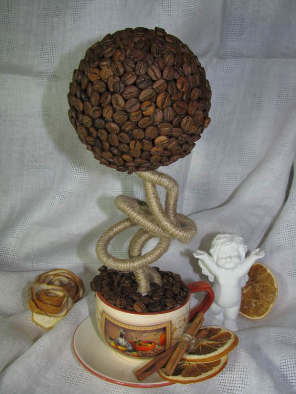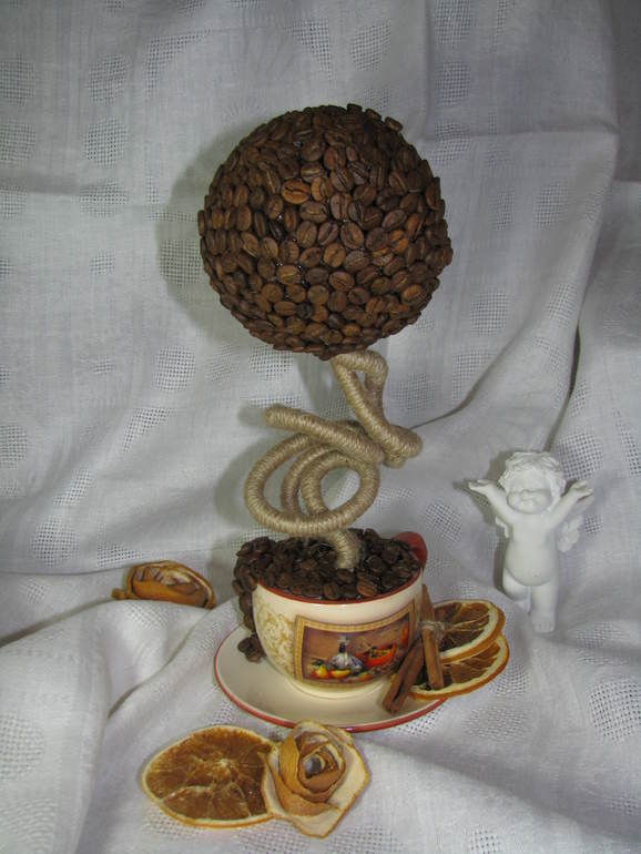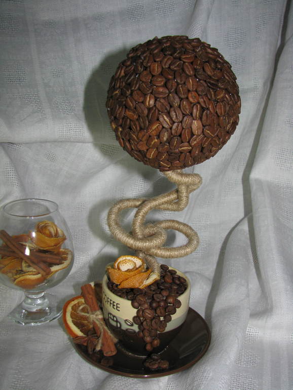 Шар крашу в коричневый цвет, первый слой зернышек клею (пистолетом на термоклей) бровкой вниз, а второй слой бровкой вверх, начинаю с макушки стараюсь клеить между зернышек, но при этом как можно ближе друг к другу.... Надеюсь понятно объяснила, спрашивайте чем смогу — помогу.