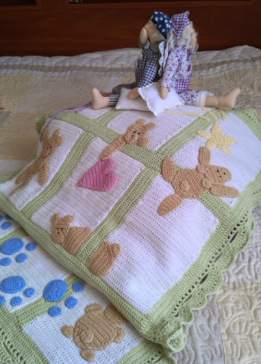 Девочки,вот такой пледик я вязала уже давно,ещё только когда мечтала стать мамой,потом повторяла его ещё несколько раз для малышей подруг и просто хороших людей.Идею этого пледика я нашла на просторах интернета. Почему то ,те,кто его видит, просит связать такой же. А я вот что подумала. Может кому-нибудь захочется своему малышу такой, но с другими героями, например с совушками или мышками,а может с Санта Клаусом, крадущимся в окно, тянущим огромный мешок с подарками и раскладывающим их под елочку. Короче,историй может быть много разных. Я с удовольствием попробую воплотить их в жизнь.Все идеи пишите. Кому моё предложение не интересно можете просто высказать своё мнение о работе. Я рада любому мнению.