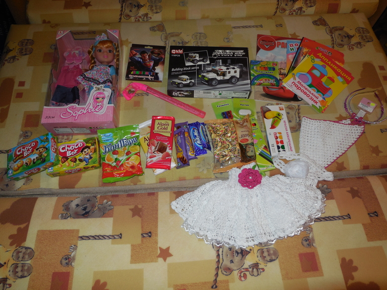 Вчера к нам приехала просто супер-посылка от Валентинки. Я даже не ожидала, что в коробке может поместиться СТОЛЬКО всего! Мы доставали и доставали новые подарочки))) Там были и игрушки и книжки и раскраски и сладости и краски-карандаши, ну и конечно, рукодельный подарок. Валя связала для дочки прелестную юбочку, косынку и повязочку. И мы не удержались от немедленной примерки ))) Дочка была в восторге, долго крутилась перед зеркалом и хихикала )))