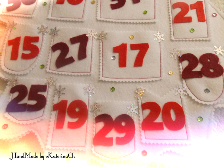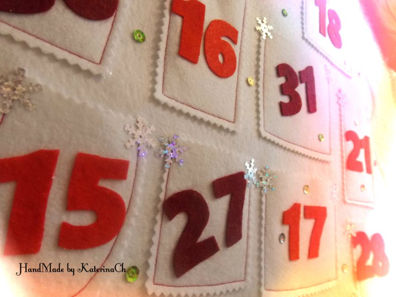 . Сделан в виде Деда Мороза, в бороде которого спрятаны 17 кармашков разных размеров, с 15 по 31 декабря. Сам календарь получился 80*40 см.