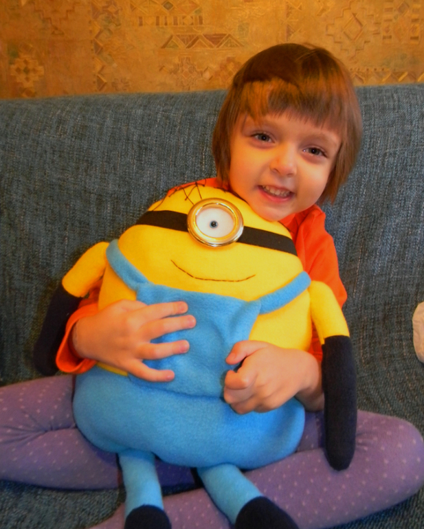 Первым из посылки на нас выпрыгнул Миньон!! Он такой мягкий,пушистый и просто очаровательный! Соня в полном восторге!!! отказывается признавать в нем подушку,это игрушка-и вообще им играть нельзя,он мой друг-выдала она!)) взяла его в охапку и ушла лепить!