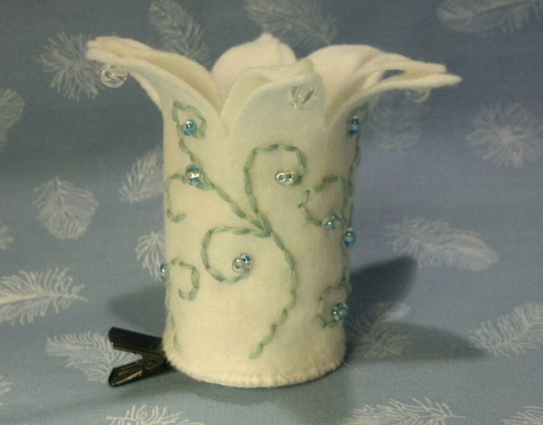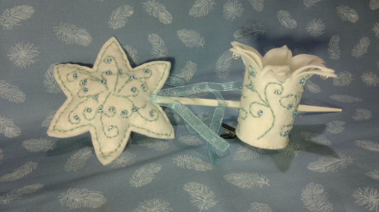 Корона и жезл изготовлены из белого фетра и украшены ручной вышивкой, чешским бисером и шифоновыми лентами нежно-бирюзового цвета.