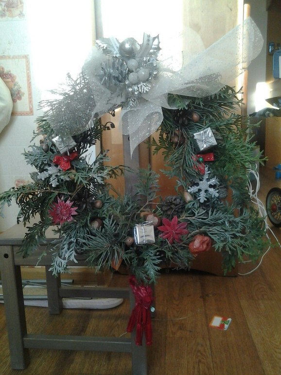 Бантики маленькие я свернула из ленты, склеив серединку, и повесила на ниточку бубенчик. Позже куплю еще колокольчик побольше и повешу его на большой фетровый бант. Бантики, тк они легче, приклеила прям к веточками туи (листикам).