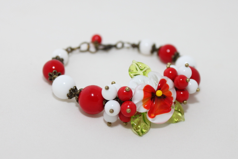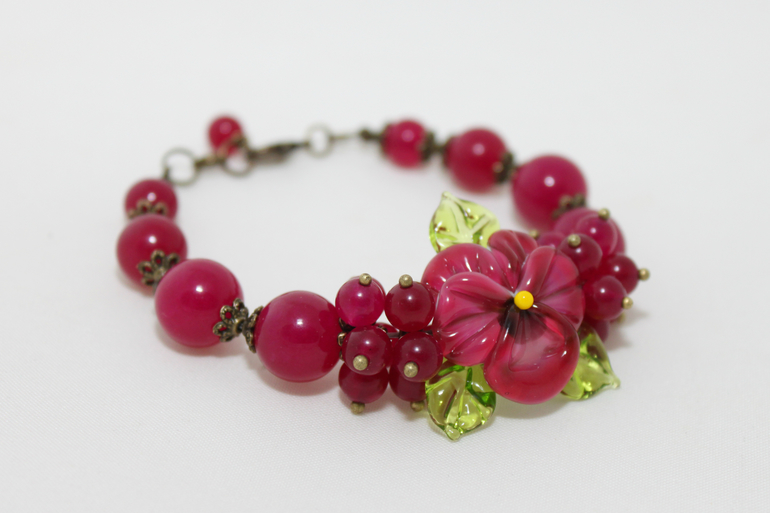 7. Браслет "Аленький цветочек" Фурнитура под бронзу, авторский лэмпворк, жадеит. Размер от 15 до 18 регулируется