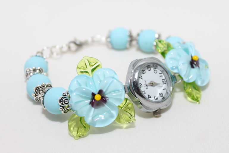 10. Часы "Анютины глазки" (голубые) Фурнитура под серебро, кварцевый механизм, бусины из полимерной глины fimo, авторский лэмпворк