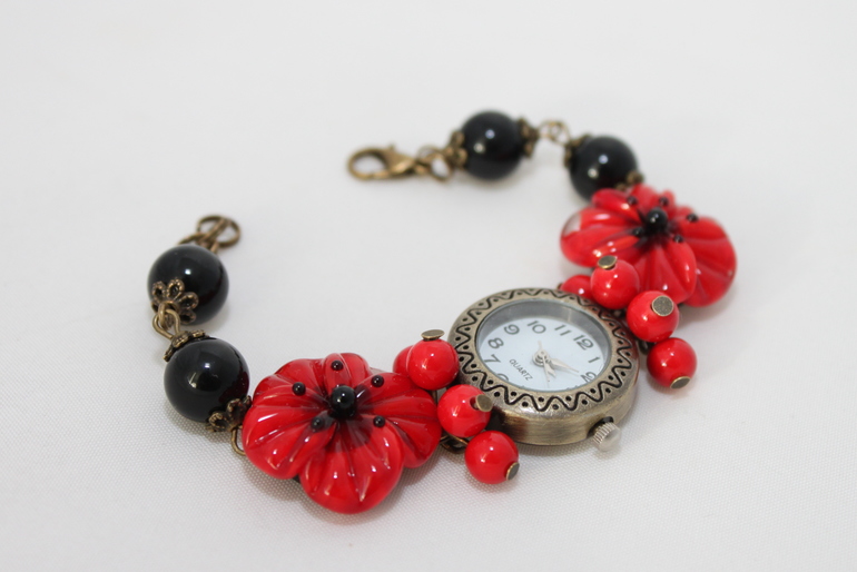 5. Часы "Маки" Бронзовая металлофурнитура, агат, коралл и авторский лэмпворк. Размер корректирую индивидуально