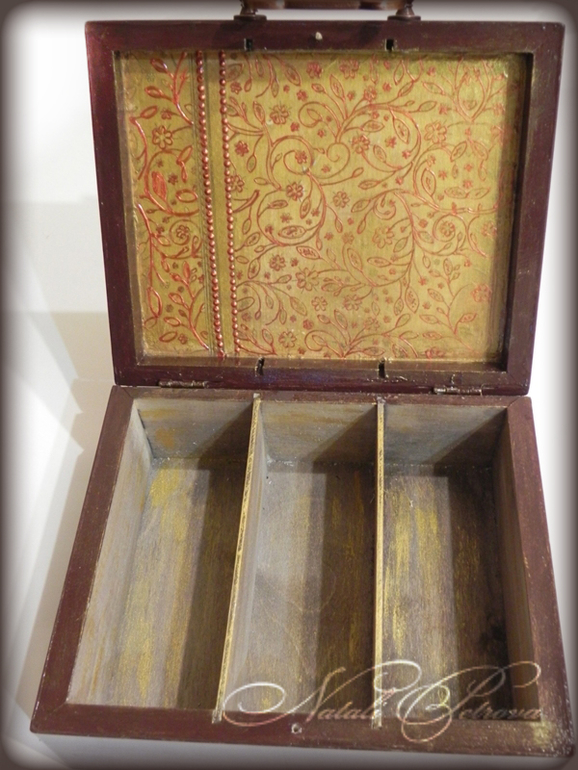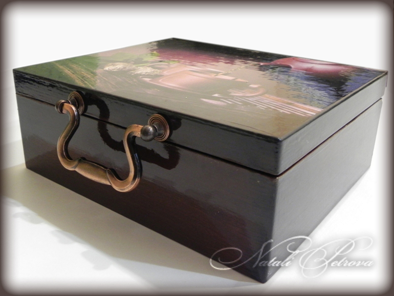 Классная шкатулка! Я помню ее в "зачаточном" состоянии в совместном декупаже — было упоминание. А у Вас была аватарка котик раньше, да?Здоровское сочетание картинки и боковин, такой глубокий цвет и идеальный лак))))И внутри шикарно смотрится!