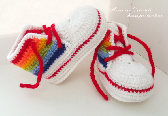 Как здорово! Комнатные сапожки))) Скажите, на подошве что-нибудь есть против скольжения? У нас в квартире линолеум ничем не застеленный, наверно просто вязаная подошва скользить будет, а идейкой загорелась — теперь хочу своей манюне связать подобные)))