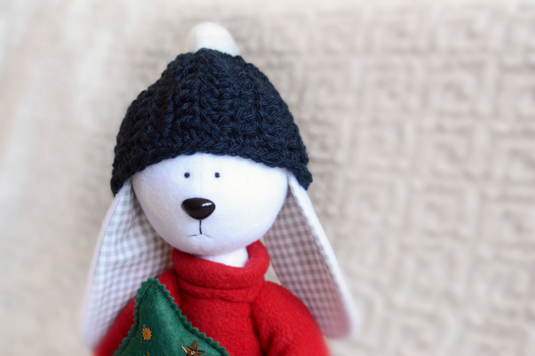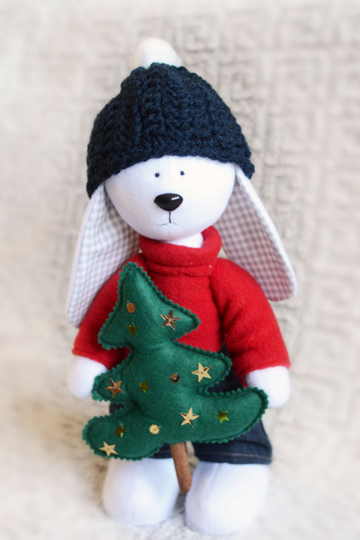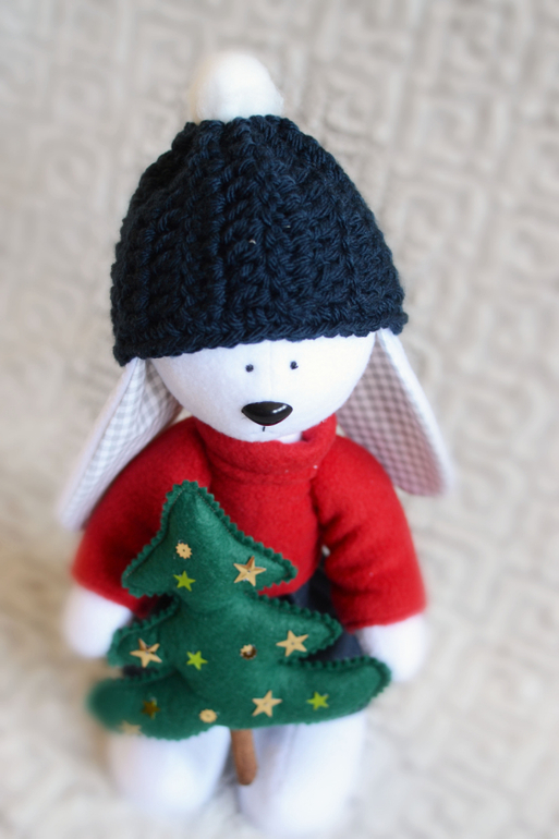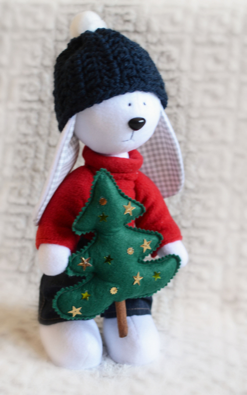 Игрушечный мир - животныемальчик-зайчик принес елочку на наш праздник