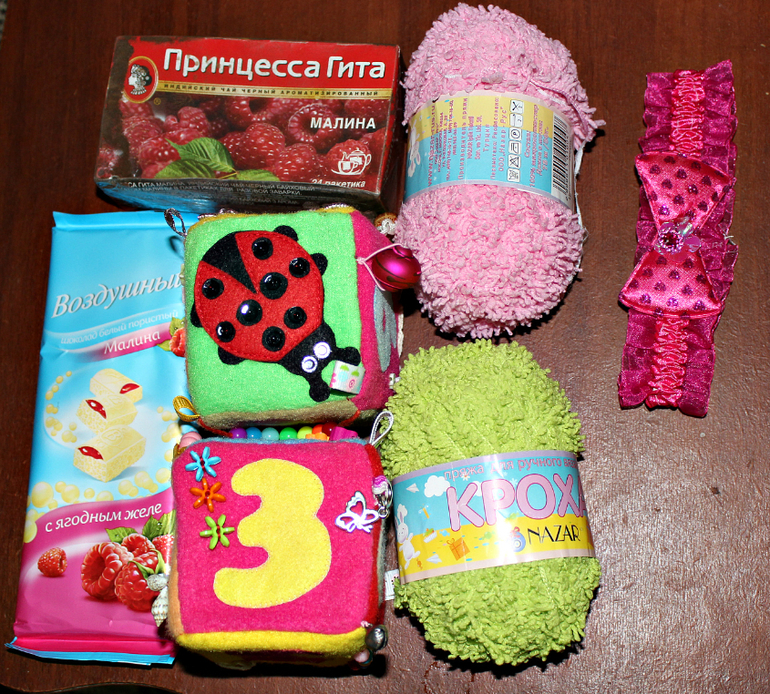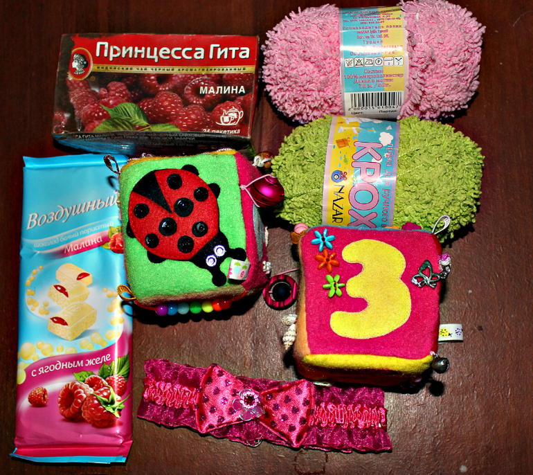 От замечательной рукодельницыXenia .Решили мы с ней сделать обмен,кстати мой самый первый.Кому интересно прошу под кад. Заказывали мы вот такие замечательные кубики,кстати в реале они намного красивее.Я в полном восторге,они такие КЛАССНЫЕ!!!! Ну и ещё Ксюша побаловала нас чайком,и шоколадом.Вот только одно не пойму как??? КАК??? ты угадала с малиной))))я её просто обожаю!!!!А ещё вот такие красивые подарочки для моей дочурки.Мы всё примерили,Лири очень идёт повязочка,только она сама решила её одеть.Немного разлохматились)))И ещё пряжа,это полный и очень своевременный сюрпризик.Я как раз вяжу,так что как раз в дело пойдут.а теперь фото))))