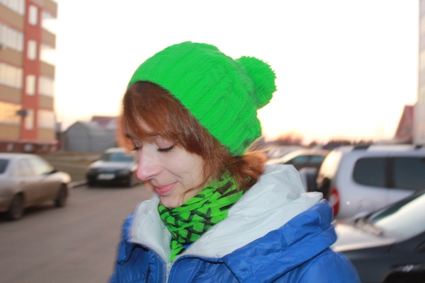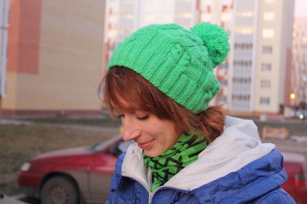 И в этом году у меня тоже зеленая зимняя шапка)) в прошлом году вязала такого же цвета и из такой же пряжи ("Детская новинка" от Пехорки в два сложения), но не сложилось у нас.... От рисунка шапки у меня было стойкое ощущение, будто мозги наружу (не самый красивый оборот, но зато точно передающий мои ощущения). Так вот связала шапку с другим рисунком и ей я довольна, никаких посторонних неприятных ощущений))