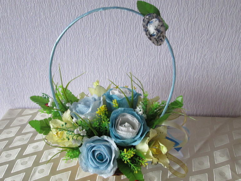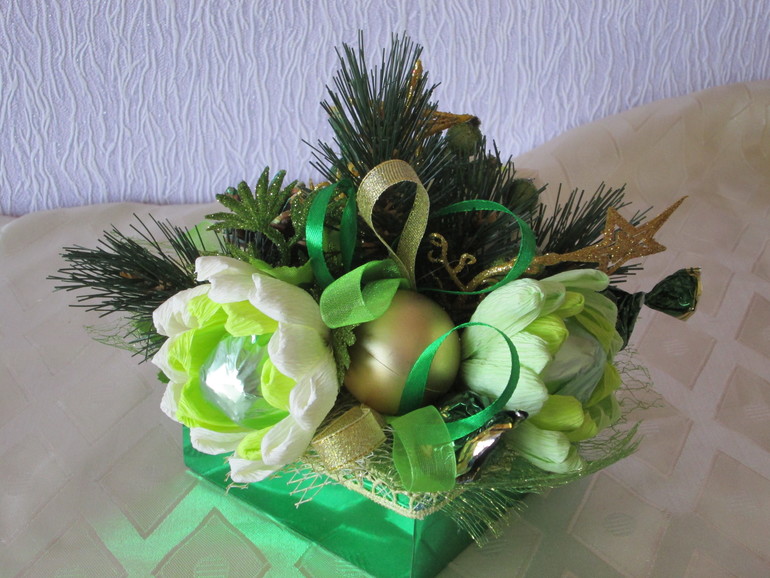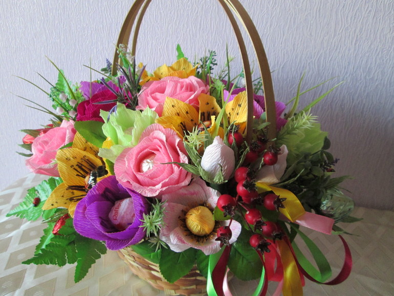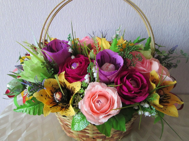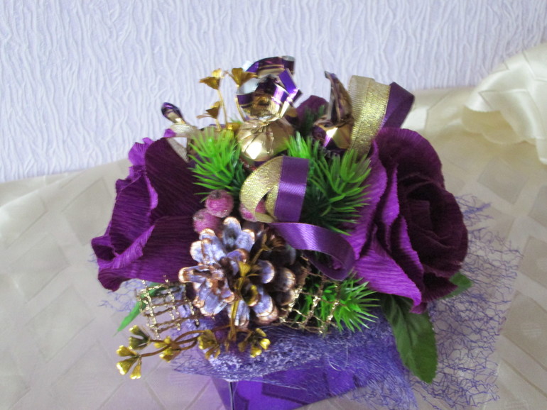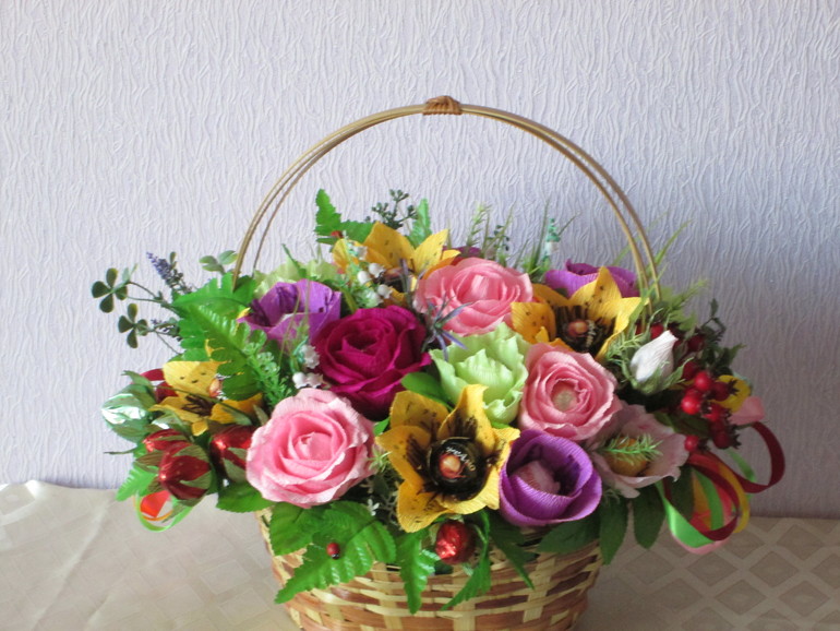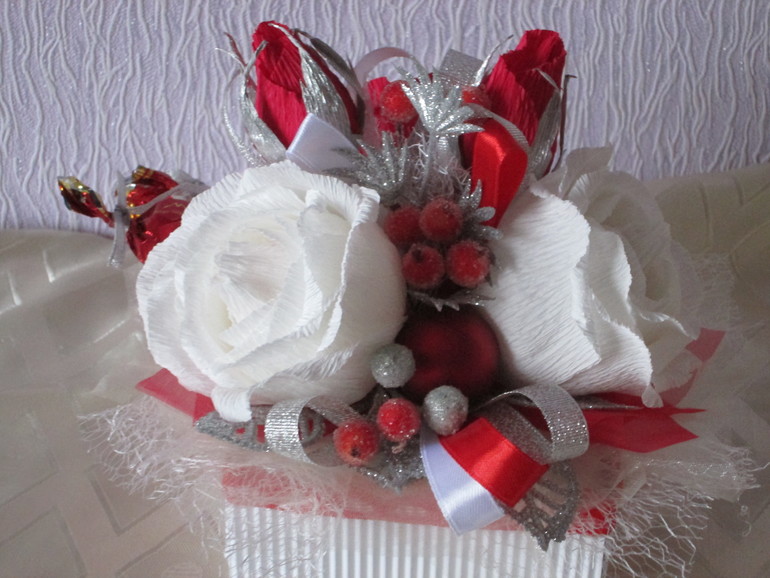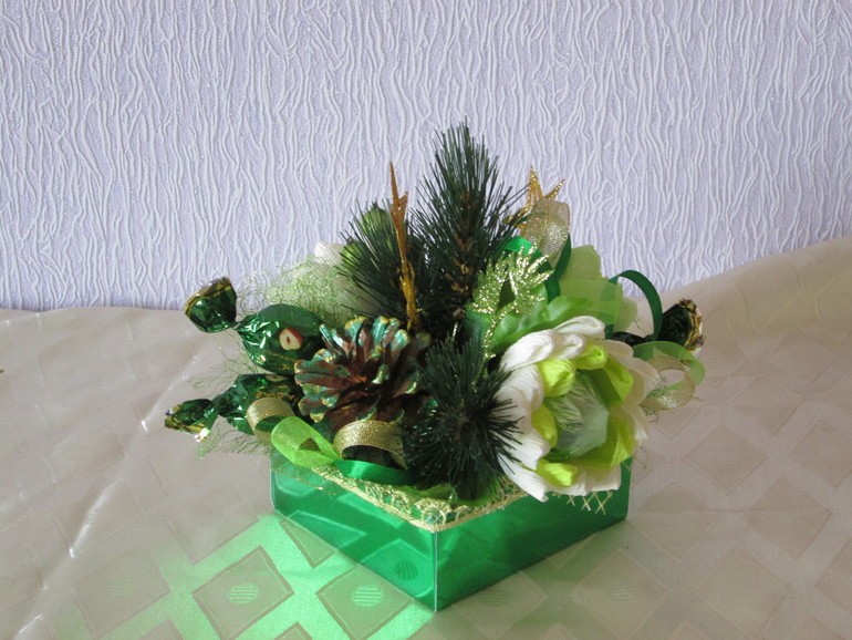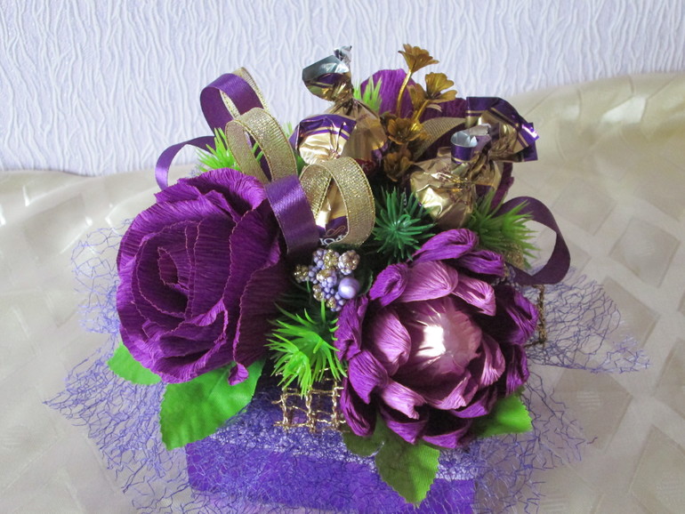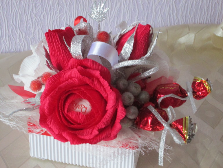 Нинуля, привет!. Эти коробочки я придумала просто как такой бюджетный вариант — вместо корзинки наклеила коробочек из цветного картона, в него вложила пенопластовый слой, обклеила верхушку и сверху букет клею. Можно на коробку конфет поставить как украшалку, а можно просто красиво завернуть и как самостоятельный подарок. Себестоимость очень маленькая, цена невелика и очень хорошо берут как дополнение к подарку. Я уже штук 12 продала, все в разных цветовых решениях