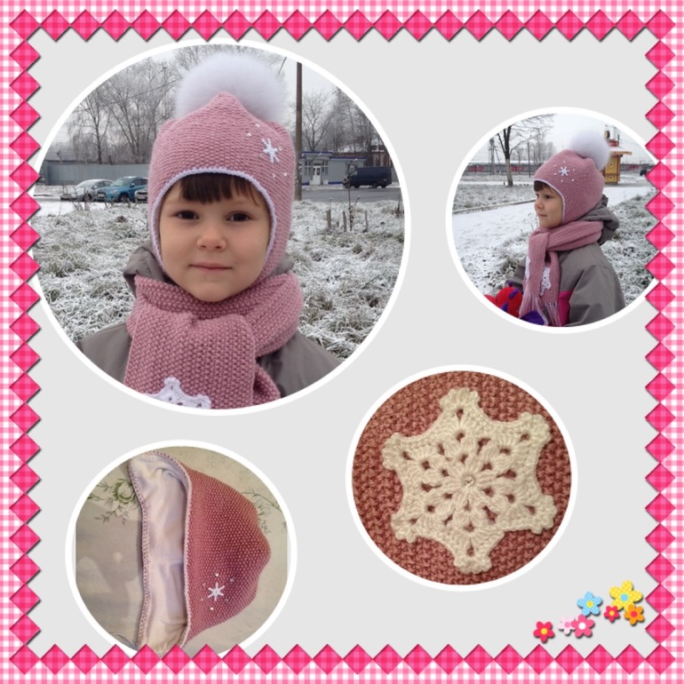 Ниточки Nako, точно название не помню, если нужно, то посмотрю. Вязала на круговых спицах №3.5 узором путанка. Размер рассчитывала на окружность головы 52см. Подклад из флиса. На шапке аппликация - снежинка-пуговичка и пришивные стразы сваровски, а на шарфике вязаная крючком снежинка.
